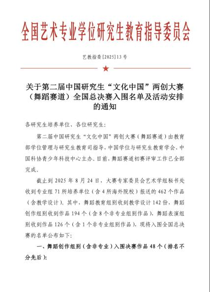 我校舞蹈学院在研究生培养过程中,注重结合专业学习与文化探索,鼓励学生将理论与实践结合。此次入围后,舞蹈学院将组织相关师生对入围成果进一步完善,为后续总决赛做好准备,力求呈现出应有的专业水平。